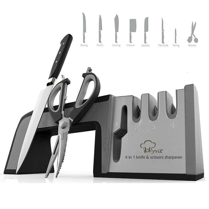 Não perca mais tempo e dinheiro comprando facas novas a todo o momento! Esse afiador 4 em 1 irá tornar suas facas afiadas outra vez! 4 espaços projetados para atender todas as suas necessidades.